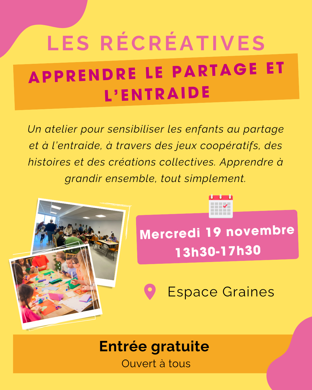 Un atelier ludique pour sensibiliser les enfants au partage et à l’entraide, à travers des jeux coopératifs, des histoires et des créations réalisées ensemble.